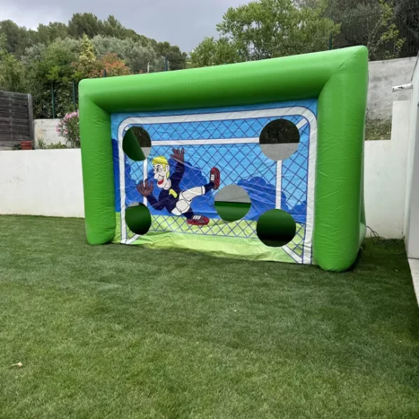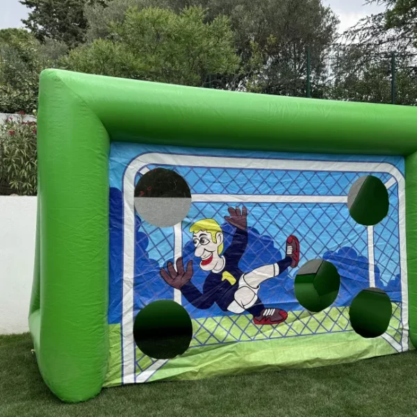 Mettez vos talents de footballeur à l’épreuve avec notre cage de tir gonflable ! Parfait pour les compétitions de précision, ce jeu consiste à marquer des points en visant les ouvertures stratégiquement placées sur la bâche.