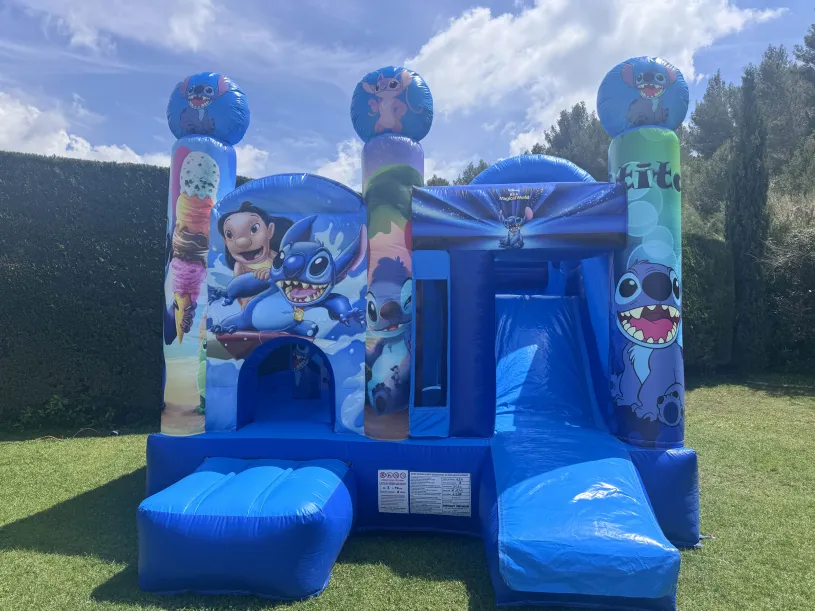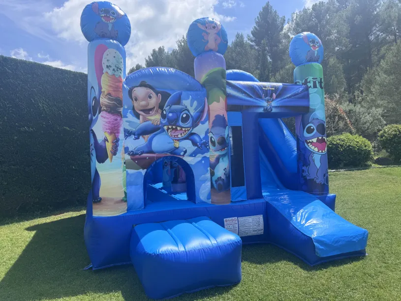Plongez dans l’aventure avec notre château gonflable Lilo & Stitch ! Cette superbe structure offre un vaste espace de rebondissement pour les enfants, avec des dimensions de 5,5 mètres de profondeur, 4,5 mètres de largeur et 3,8 mètres de hauteur. Doté de sujets captivants de Lilo & Stitch, ce château invite les enfants à explorer l’univers de leurs personnages préférés. Un super toboggan ajoute une dose supplémentaire de plaisir, tandis qu’un toit assure une protection contre le soleil. Offrez à vos enfants une expérience exclusive et inoubliable avec notre château gonflable Lilo & Stitch !