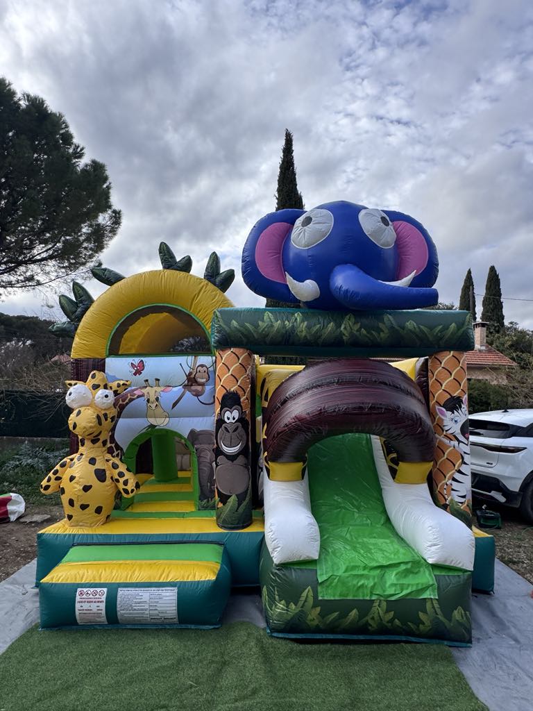Embarquez pour un safari inoubliable avec ce chĂąteau gonflable  sur le thĂšme des animaux sauvages ! Avec son Ă©lĂ©phant gĂ©ant, sa girafe amusante, son gorille souriant et ses dĂ©cors tropicaux, ce jeu gonflable plonge les enfants au cĆur de la jungle pour des heures dâamusement.